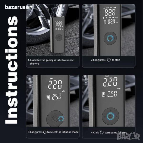 【Широка употреба】 Включени са 3/три/ накрайника и допълнителен предпазител. Не само помпа автомобилни гуми ,с всеки накрайник Schrader напомпва SUV/4Х4/ автомобили, също така предназначен за надуване на мотоциклети, велосипеди, скутери, топки, пояси за плуване, топки и други надуваеми предмети