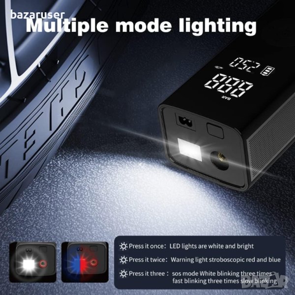 【4+N интелигентни режима】4/четири/ вида предварително зададени режими на надуване (топки, велосипеди, мотоциклети и автомобили) . Режимът избран от Вас, позволява да зададете стойност на налягането (3-150psi) според обекта на надуване. Операцията е лесна за настройка, лесна за използване и отговаря на вашите предпочитания.