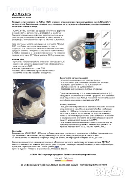 ADMAX ® PRO е активен едноразов очистител; със своята формула с изключителни детергентни и дисперсантни свойства, препаратът дава едно мощно решение за ефективно елиминиране на кристализиралите отлагания и замърсявания в резервоара, помпата и инжектора на системата SCR (AdBlue®).