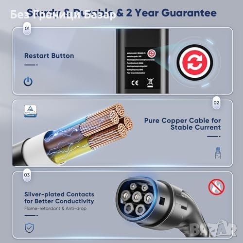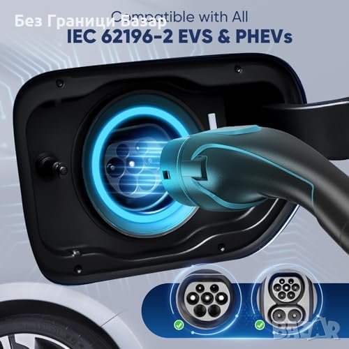 Тип 2 към 3-пинов контакт: Компатибилен с всички електромобили и хибриди.