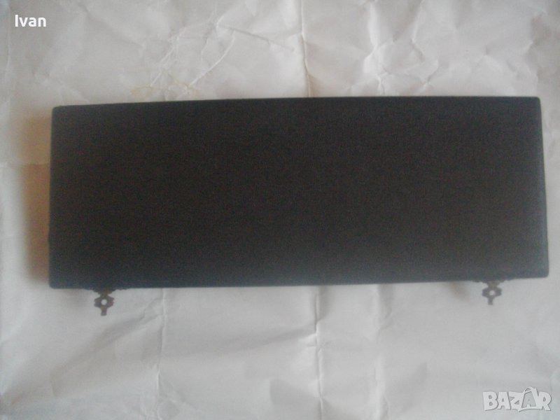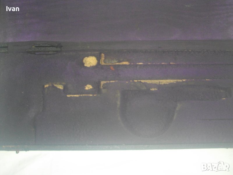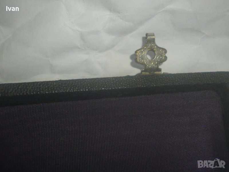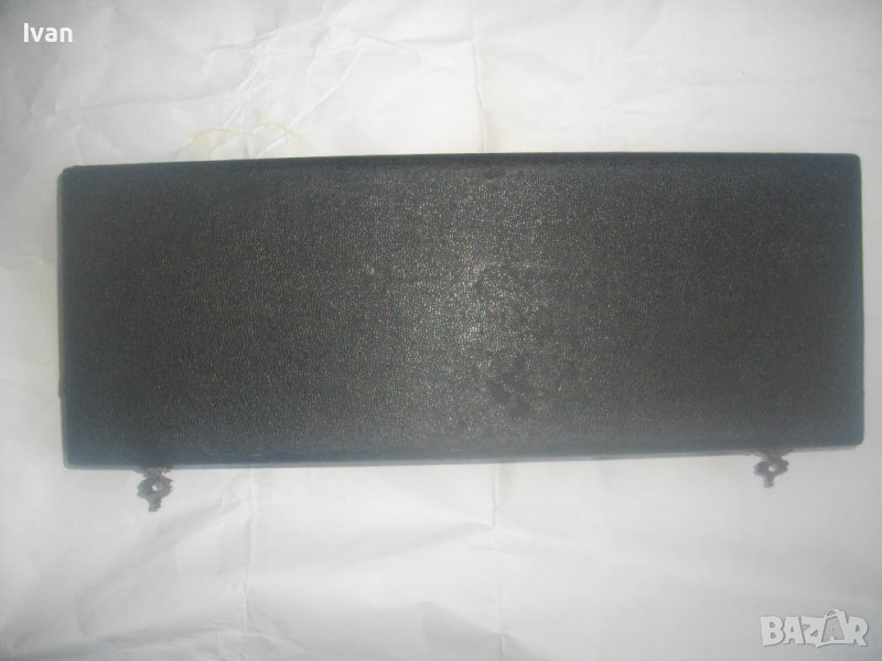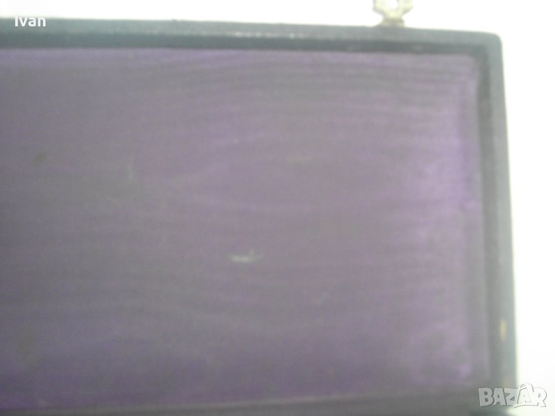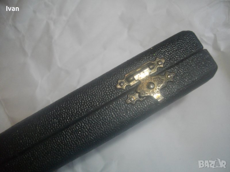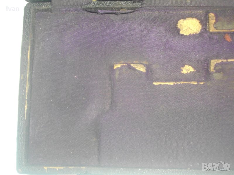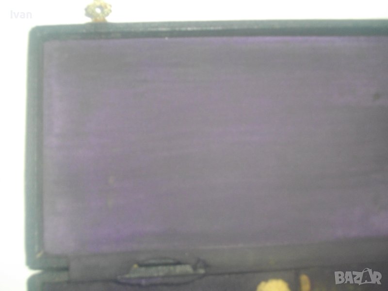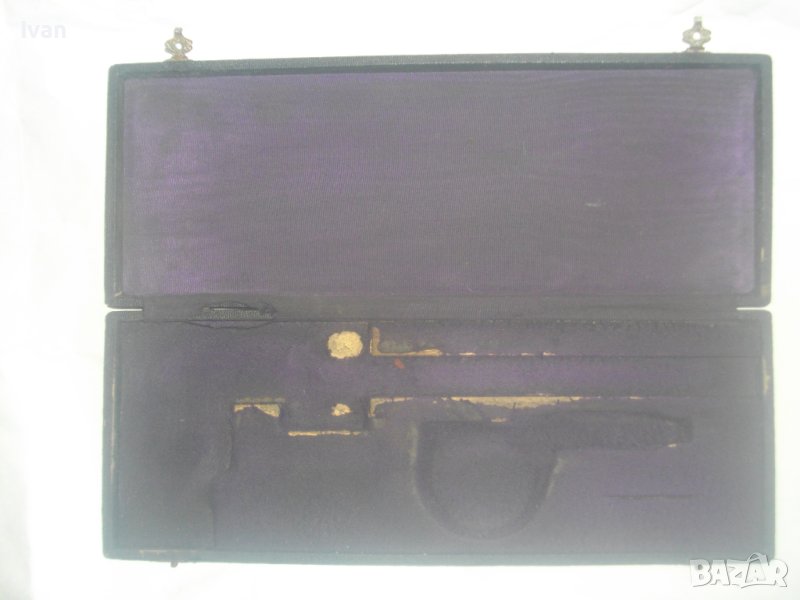 Старинна кутия за шублер от 20-ти век. Ръчна изработка. Дървена тяло с черна мукавена кожа покритие. Външната лицева част на кутията е запазена, вътрешната част е подплатена с плат кадифе и сатен, като вътрешната платова част е поизносена и леко протрита. Метални капчалки външно на кутията ръчна изработка с ръчно декорирани орнаменти по копчалките. Метални панти на кутията.
