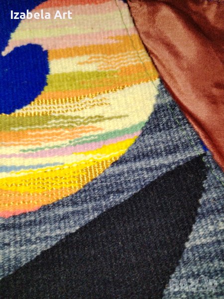 Дамски елек от памучен плюш и ръчно тъкани елементи с подплата .Елементите са направени с технология ръчно тъкане на вертикален стан( както се тъкат котленски и чипровски килими).Преждите са обагрени ръчно в зависимост от проекта. Всяко елече е отделен проект. Цвета на елека е в тон с тъканите елементи. Колекцията е създадена в продължение на една година