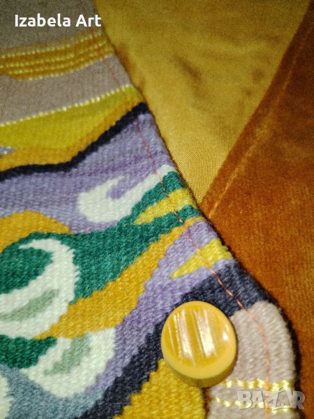 Дамски елек от памучен плюш и ръчно тъкани елементи с подплата .Елементите са направени с технология ръчно тъкане на вертикален стан( както се тъкат котленски и чипровски килими).Преждите са обагрени ръчно в зависимост от проекта. Всяко елече е отделен проект. Цвета на елека е в тон с тъканите елементи. Колекцията е създадена в продължение на една година