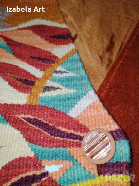 Дамски елек от памучен плюш и ръчно тъкани елементи с подплата .Елементите са направени с технология ръчно тъкане на вертикален стан( както се тъкат котленски и чипровски килими).Преждите са обагрени ръчно в зависимост от проекта. Всяко елече е отделен проект. Цвета на елека е в тон с тъканите елементи. Колекцията е създадена в продължение на една година