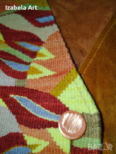 Дамски елек от памучен плюш и ръчно тъкани елементи с подплата .Елементите са направени с технология ръчно тъкане на вертикален стан( както се тъкат котленски и чипровски килими).Преждите са обагрени ръчно в зависимост от проекта. Всяко елече е отделен проект. Цвета на елека е в тон с тъканите елементи. Колекцията е създадена в продължение на една година