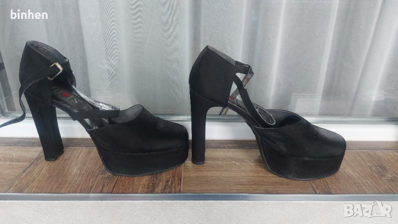 Дамски елегантини черни обувки(лъскав сатен)Ток 13см.Обувките отговарят на 39 номер(25см).Носени веднъж.Цена 10euro.