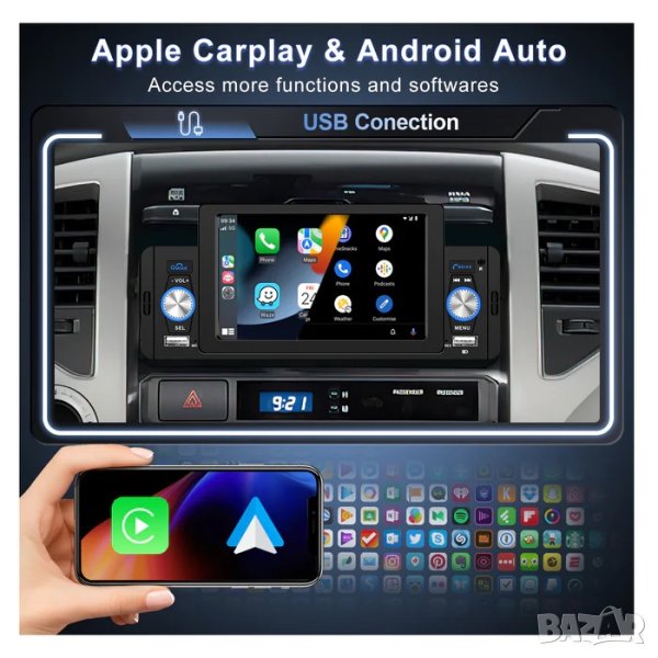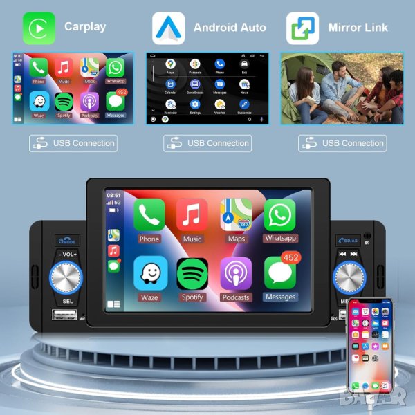 Мултимедия за кола, супер качество с голям 5 инча дисплей,, за най-добрия модел. Това е най-качествения модел предлаган на пазара с 5’’ инча дисплей! Пускане на музика през блутут и AUX смяна на светлината на копчетата, 2 броя USB за флашка или зарядно и слот за micro SD карта мулти тъч бутони и дисплей, RDS, Car Play, Android Auto и други 1-din Mp3 / Mp4 / Mp5 Car Player – възпроизвежда на дисплея видео клипове, филми и др.