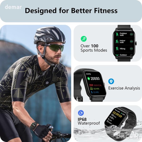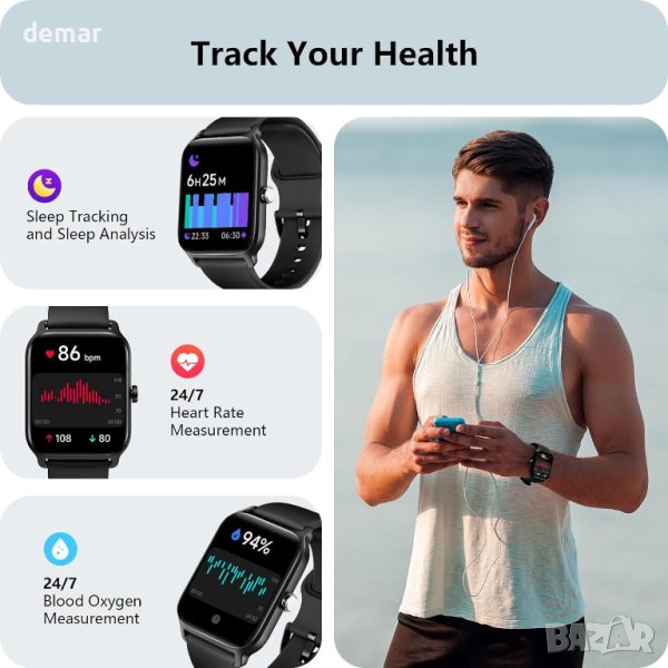 Универсален смарт часовник с вграден микрофон и Hi-Fi високоговорител за директни разговори, синхронизиране на SMS от приложения като WhatsApp и Facebook и интеграция на Alexa за задачи със свободни ръце. Наблюдавайте здравето си 24 часа в денонощието, 7 дни в седмицата с точни показания на SpO2, сърдечен ритъм, нива на стрес и напомняния за менструалния цикъл, заедно с цялостен анализ на съня. Със 100 спортни режима и водоустойчив рейтинг IP68, следете дейностите си и останете мотивирани. Насладете се на ярък 1,8" HD сензорен екран с персонализируеми циферблати, дълъг живот на батерията и многофункционални функции като управление на камерата и възпроизвеждане на музика. Съвместим с Android 6.0, iOS 9.0 и по-нови версии.