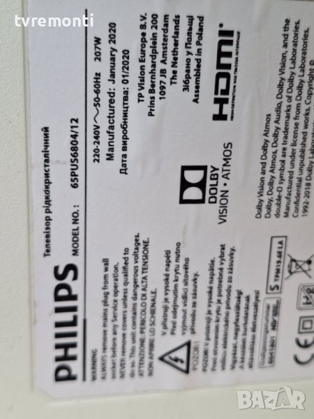 Захранване 715GA018-P01-000-003M Philips65PUS6804/12 for 32inc DISPLAY TPT650U2-EQYA4.G борда е гарантирано работещ Демонтиран от телевизор Philips модел, 65PUS6804/12 със счупен дисплей TPT650U2-EQYA4.G тесвана от нашия техник