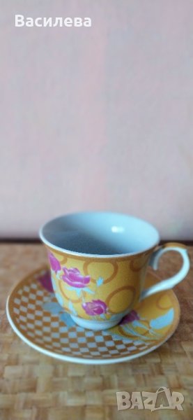 Съвсем нов сервиз за кафе, 6 чаши и 6 чинийки. Диаметър на чинийката 14 см, диаметър на чашката 9 см, височина на чашката 8 см.