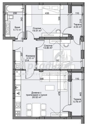 Апартаментът се състои от дневна с трапезария и кухненски бокс, две спални, входно антре, баня с тоалетна и две тераси.