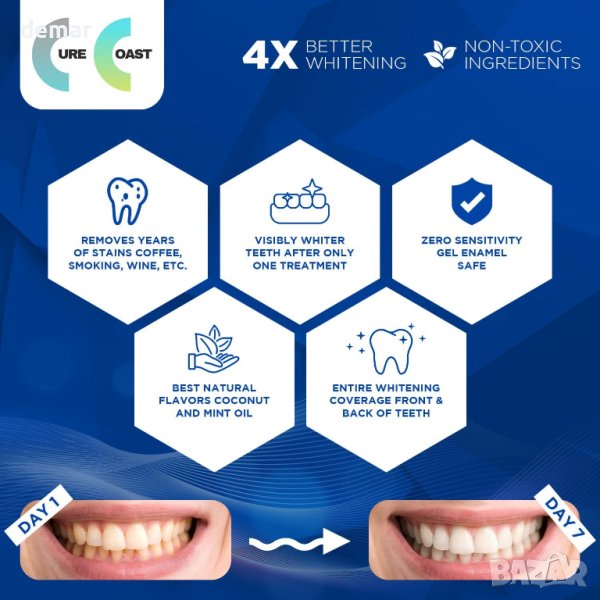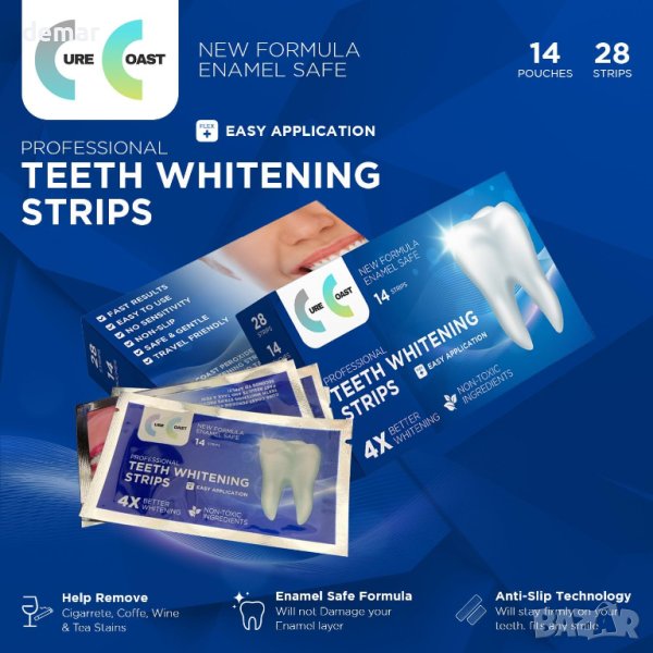 Изпитайте по-ярка усмивка само за 7 дни с нашите произведени в Обединеното кралство професионални ленти за избелване на зъби от Cure Coast, предлагащи удобно, безболезнено лечение у дома. Проектирани за безопасност и ефективност, тези одобрени от зъболекари ленти нежно премахват петна от кафе, вино и пушене, без да увреждат емайла, благодарение на PAP формула без пероксид. Комплектът включва 28 избелващи ленти, безплатна отварачка за уста и водач за нюанси, всички подкрепени със 100% гаранция за удовлетворение. Пригответе се за естествено изглеждаща, по-ярка усмивка без никакъв дискомфорт.