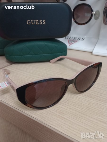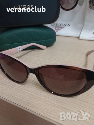 Дамски слънчеви очила Guess с форма, като котешко око. Рамките отпред са кафяви с тигрови нотки. Дръжките са от качествена пластмаса с лого на марката Guess, като е избран красив розов цвят. Уникалната форма на стъклата е завършена със скосени връхчета, изтеглени малко нагоре. Слънчевите очила имат УВ защита. Подходящи са за жени, които търсят предизвикателство, стил, качество и комфорт.