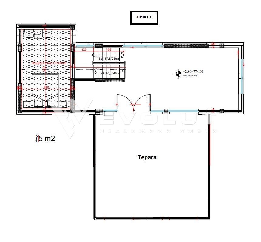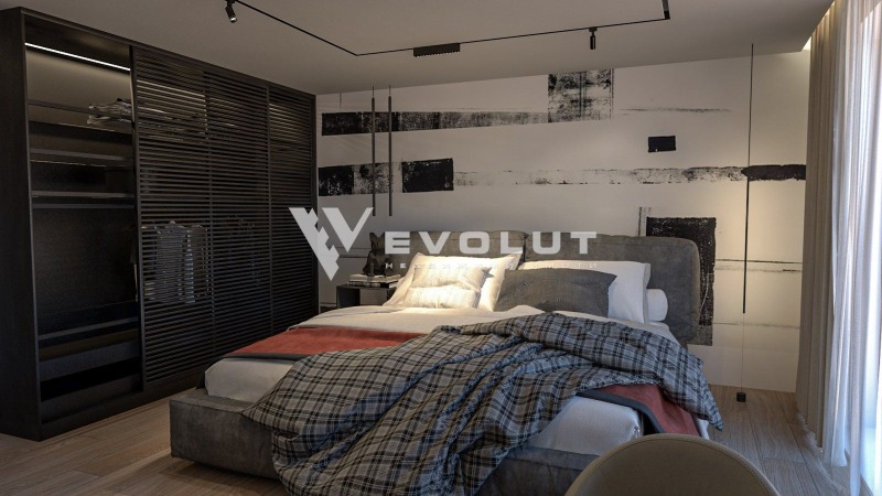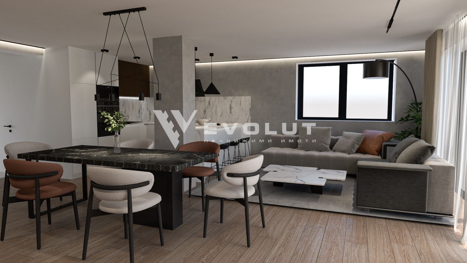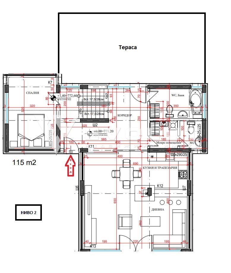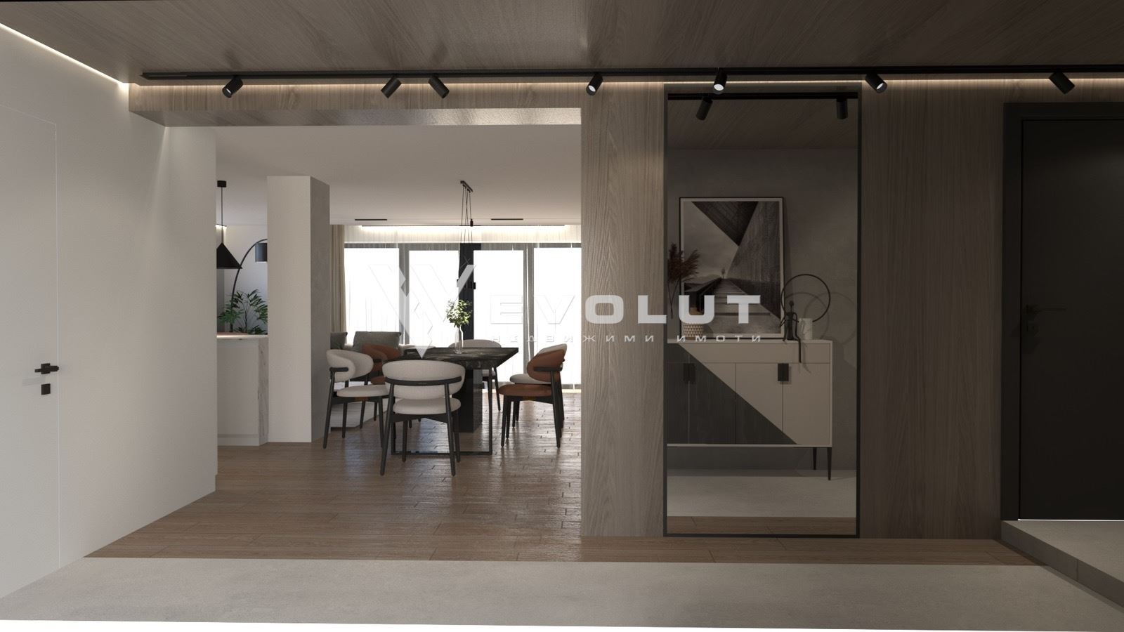 -Входно антре с гардероб - /10кв.м./, дневна с кухня и трапезария /70 кв. м./, три бани, две мокри помещения, две тераси /45 и 50 кв.м./