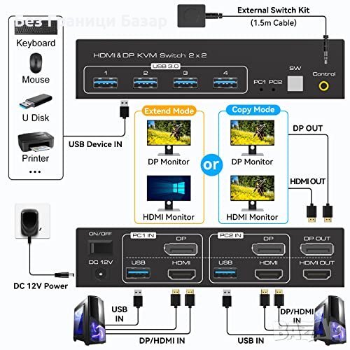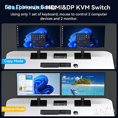 Двоен монитор КВМ превключвател: Свързва 2 компютъра с 2 монитора и устройства за въвеждане.