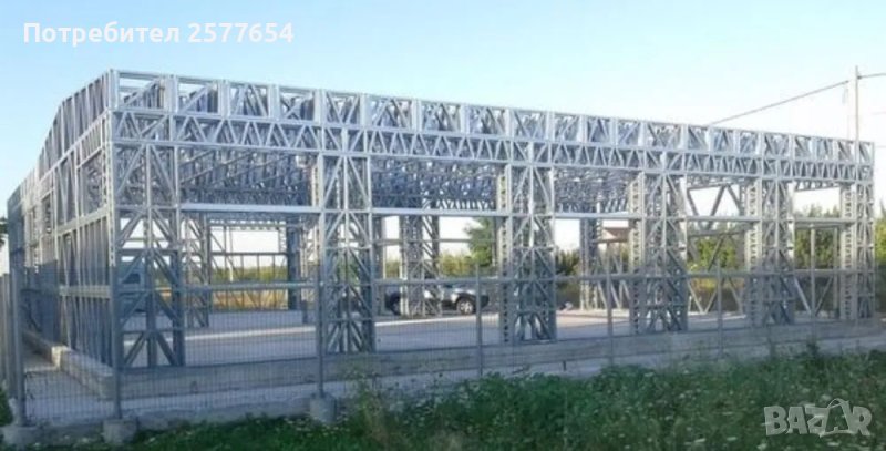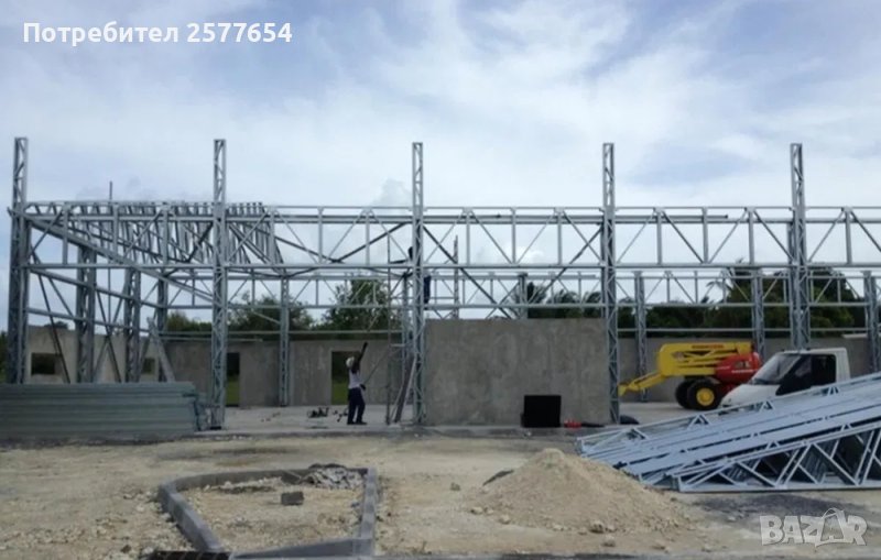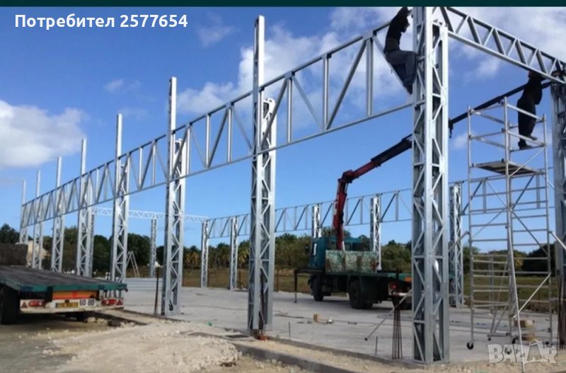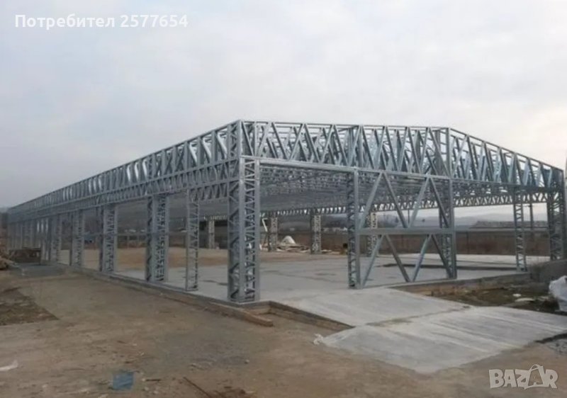 Изработка на халета ( индустриални сгради ) с стоманена поцинкована конструкция цинково покритие, на болтова връзка. Конструкции за навеси, складове, и за автомивки. Обявената цена е за 1 кг конструкция на несглобени профили с включен монтаж и конструктивен монтажен план.
