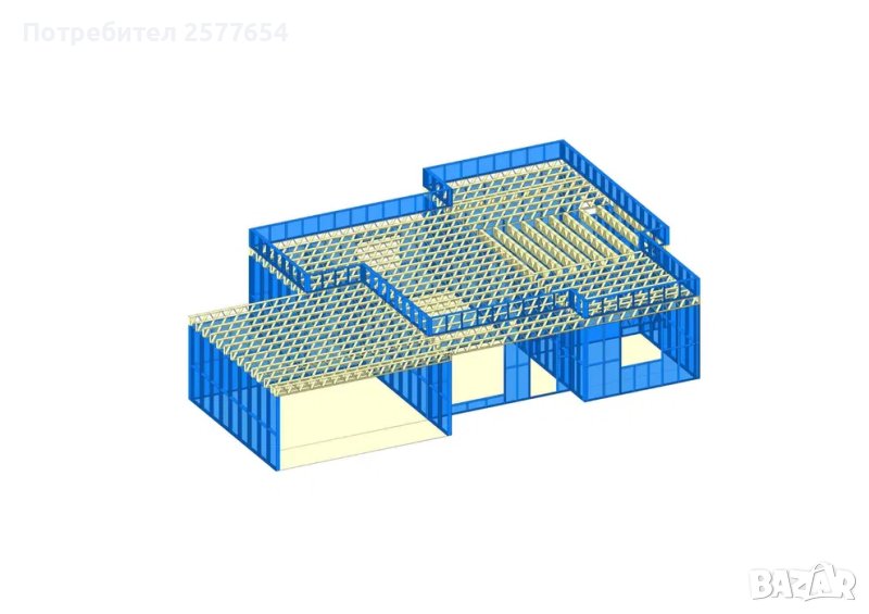 Конструкция за бунгало / преместваема къща 144.60м2 - етап Конструкция - готови за сглобяване профили. Според новите прмени в ЗУТ по чл.56, дават възможност къщата да се води и преместваема, с което ще спестите над 10-15 000 лева, както и много време и нерви. Нашият екип проектанти изработва и проекти за преместваеми къщи.