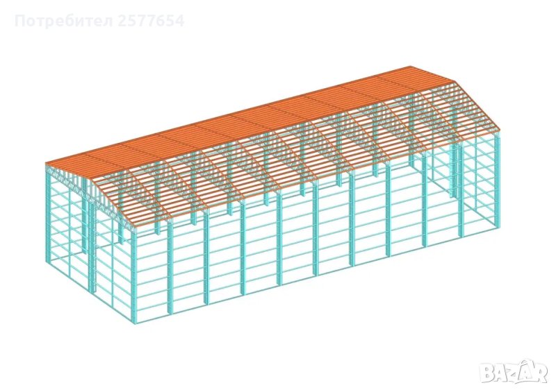 Конструкция за Халета, Автосервизи, Складове, Магазини 360м2 -12м х 30м х 7м - етап Конструкция - готови за сглобяване профили. Халето е с предна двуетажна административна част , или магазин.