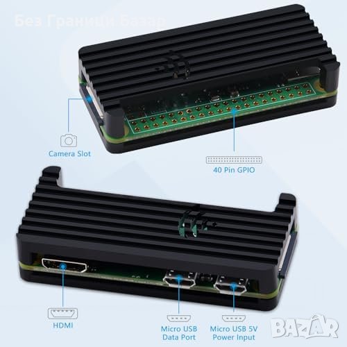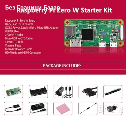 Включено в комплекта: Raspberry Pi Zero W, алуминиева кутия, захранващ блок с адаптер, HDMI кабел 4K, USB OTG хъб с 4 порта, превключващ кабел, OTG кабел, HDMI адаптер, GPIO заглавка.