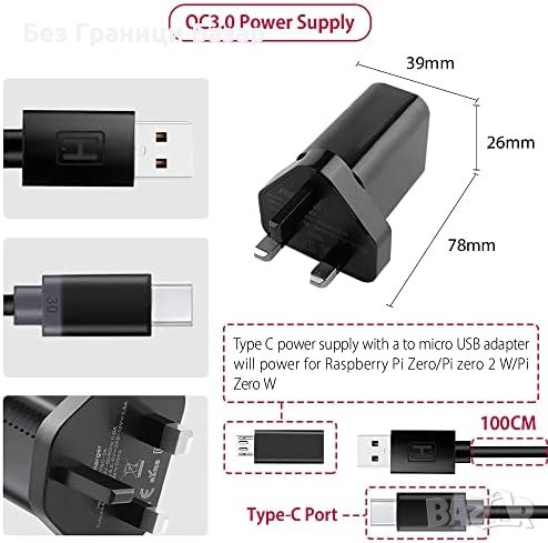 Захранване QC3.0 с USB-C: Стабилно 5V 3A захранване, защити срещу пренапрежение и късо съединение, идеално за Raspberry Pi Zero W.
