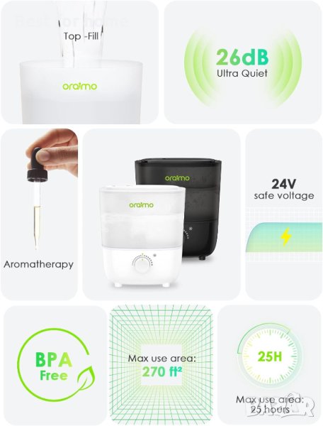 РАБОТЕТЕ БЕЗШУМНО: Овлажнителят Oraimo Cool mist няма силно бръмчене или бълбукане. Безшумно овлажнява вашата спалня с ниско ниво на шум от 26 децибела, идеално за вашето бебе и за сън без разсейване през нощта, като ви помага да дишате лесно през цялата нощ.