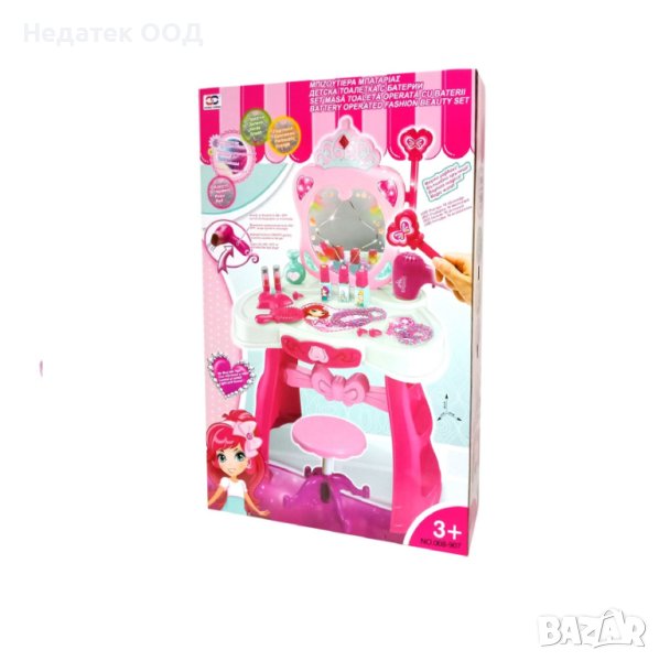Скрин с огледало, седалка и 16 аксесоара. Има красиви цветни светлини, реалистичен сешоар със звук и бижута, козметика и четка. Заедно с магическа пръчка. Работи с 1 AA батерия за сешоара (не е включена) и 3 AA батерии за огледалото (не са включени).