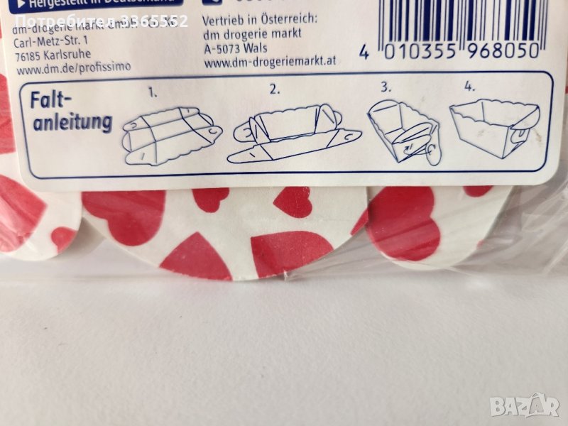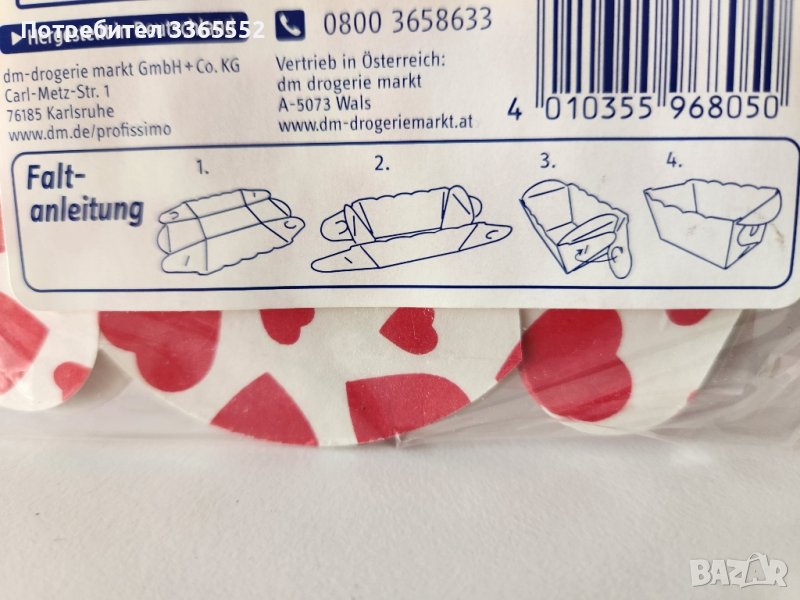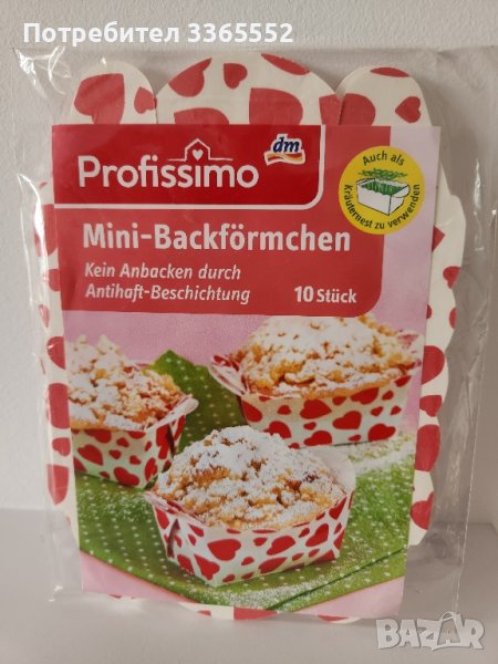 Продавам комплект от 10 броя картонени форми за печене на мъфини, мини кексчета, с декорация на сърца.