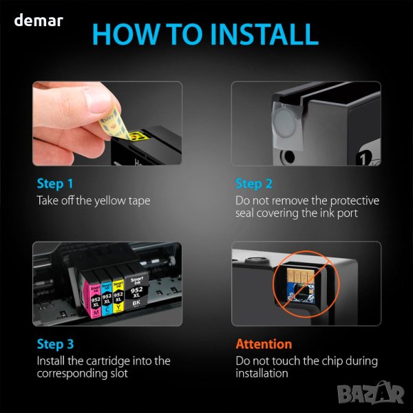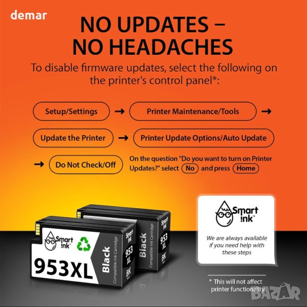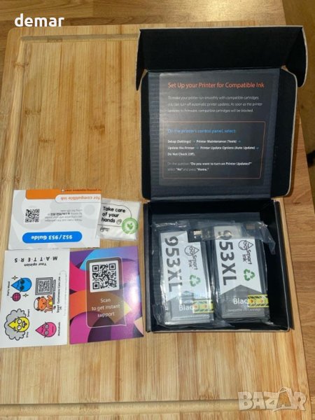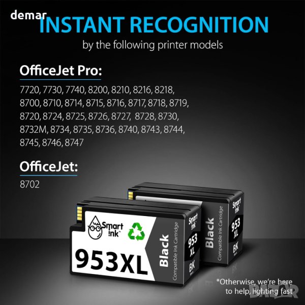 Този пакет включва 2 черни 953 XL касети. Всяка XL касета позволява отпечатване на до 2000 страници при 5% покритие на страницата. Касетите Smart Ink се доставят с най-новата версия на чипа, което гарантира съвместимост с всички съвместими принтери, дори тези с най-новия фърмуер. Инсталирането е без усилие, тъй като всички съвместими принтери незабавно разпознават и работят безпроблемно със Smart Ink мастило.