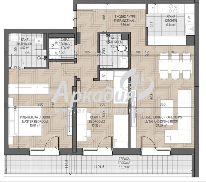 Апартаментът се състои от дневна с трапезария и кухненски кът, две просторни спални, коридор, две бани с wc, килер и една тераса.