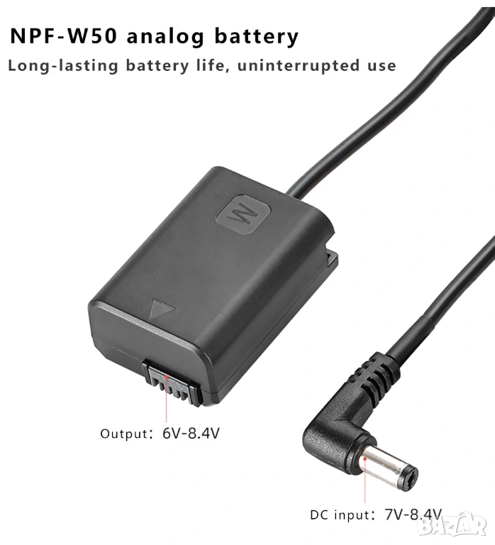 Плочка за батерия NP-F и дъми батерия за Sony A7, A7 II, A7R, A7R II, A7S, A7S II, A3000, A5000, A5100, A6000, A6100, A6300, A6400, A6500, A55, RX10, RX10II, RX10,III, RX10IV, ZV-E10, NEX-3/5/7 и др. Комплекта позволява непрекъсната работа чрез захранване от външна батерия NP-F. В комплакта са включени държачи за гимбал или фотоапарат.