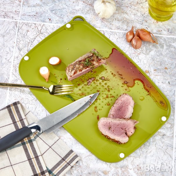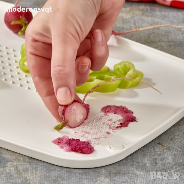 Широка площ на рязане, идеален размер. Двустранна режеща повърхност. Ъгловата режеща повърхност събира трохи и течности. Преграда против наводнение. Нехлъзгащо уплътнение. Лесно/бързо настъргване. Специална шипова зона, която предотвратява изплъзването на храната. Може да се закачи, закачалката е интегрирана. Храната може да се сервира. Дизайн по поръчка. Персонализирани цветови опции.