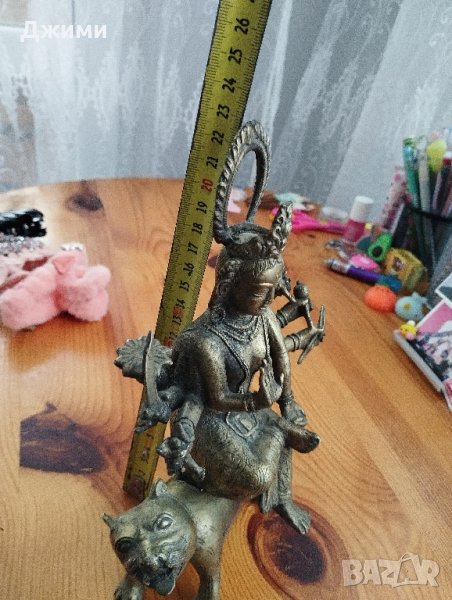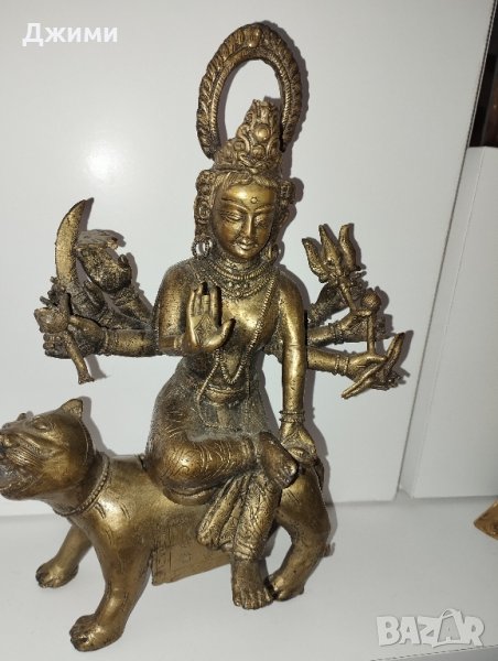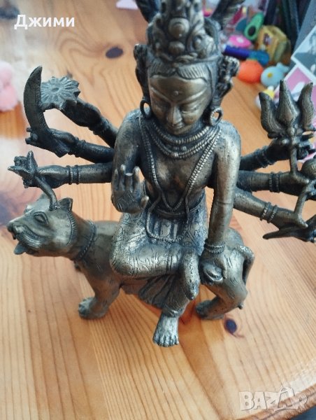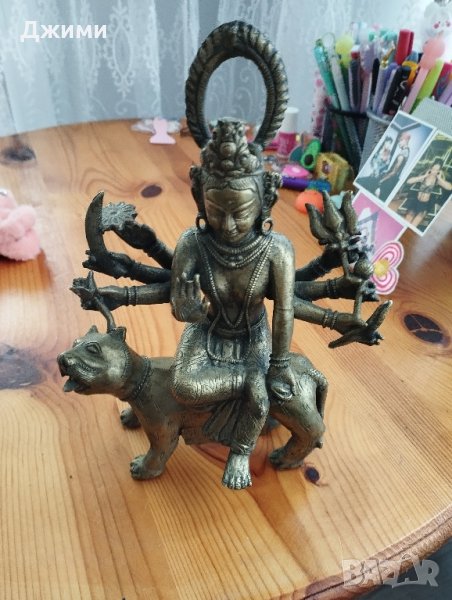 много стара статуетка която отразява богиня яздеща тигър може по търсачката да проверите във ебай или катавики какви цени искат и повечето не отса налични