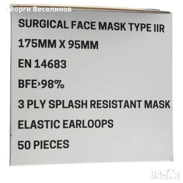 Опаковка - кутия от 50 броя маски , като те са допълнително опаковани в найлонов плик;