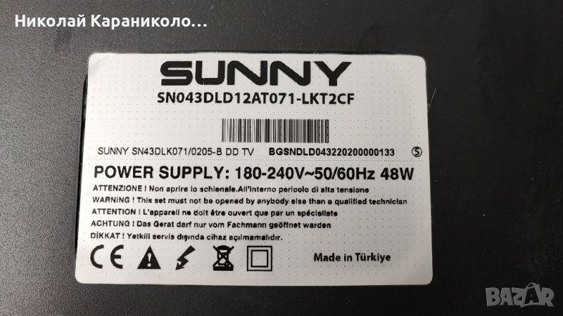 Продавам тв SUNNY SN043DLD12AT071 за части по причина-счупена матрица/LC430DUY-SHA1/.Редовни съответно: