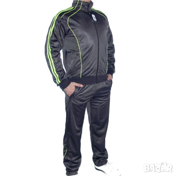 Мъжки спортен екип RAYMOND, графит с електриково зелено, полиестер. Произведено в България. Горнището има 2 джоба, долнището също има 2 джоба. Всички джобове са със ципове. Долнището е с прав крачол. Високо качество на материя и изработка.
