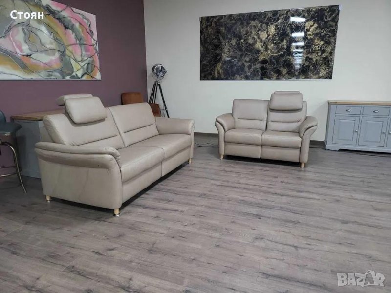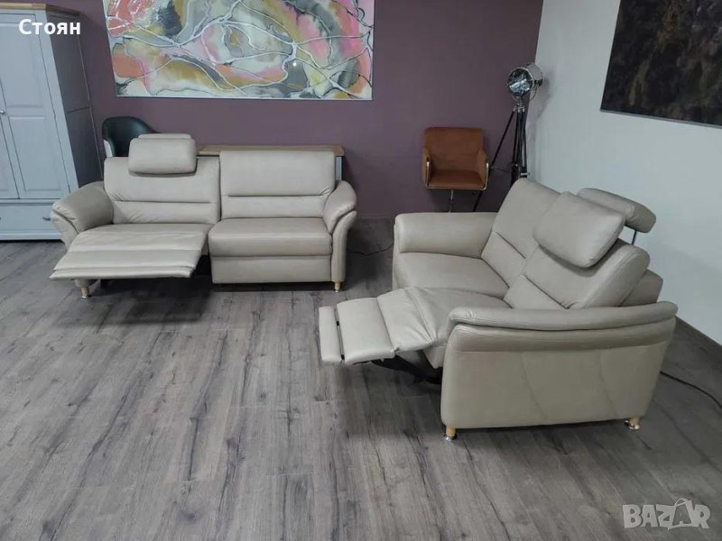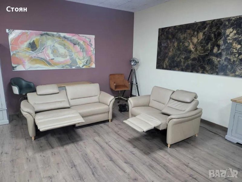 Комплект кожени дивани тройка и двойка цвят камел с по един електрически релаксиращ механизъм за краката на всеки диван.