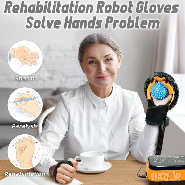 Относно този артикул【Кой се нуждае от това】: Нашите роботизирани ръкавици Smiletech за рехабилитация на ръце са идеални за рехабилитация след инсулт, хемиплегия и лоша подвижност на пръстите. Те са подходящи и за хора с мускулна атрофия на ръцете, огъване на ръцете, китки и пръсти, тъй като могат да помогнат за подобряване на мускулния тонус за тренировка на мускулите на пръстите. Ако страдате от слабост на пръстите, крампи или неконтролируемо стискане на пръстите, нашите ръкавици могат да бъдат много ефективно решение. Тази ръкавица е и страхотен подарък.【Надстройте обучението с пет пръста】: можете да тренирате петте си пръста независимо, без да се налага да завъртате вентила (необходими са по-стари модели), за да подобрите тренирането на всеки пръст. Когато трябва да тренирате един или повече пръсти, може да се постигне просто докосване на иконата на панела на екрана. Нова разработка на Mirror Bracelet: обучението с огледало е по-лесно и по-удобно, всичко, което трябва да направите, е да задържите или пуснете лентата и ръкавиците на ръцете ви ще хванат или пуснат в синхрон.【Нови ръкавици с подобрена функция за памет】: в сравнение с традиционните ръкавици, ние добавихме функция за памет, която се прилага за автоматичен режим и всички други режими (нови). Можете да запишете този тренировъчен режим, като натиснете бутона за запазване на устройството, и можете да използвате същия тренировъчен режим директно следващия път, когато включите машината. И за да избегнем умората от претрениране, ние също така настроихме защитен механизъм, продължителната употреба от 20 минути автоматично ще спре.Ръкавици Размер: S: ширина на ръката: 5-7CM, дължина на ръката: 13-15cm; M: ширина на ръката: 6-8CM, дължина на ръката: 14-16cm; L: ширина на ръката: 7-9CM, дължина на ръката: 16-18cm; XL: ширина на ръката: 8-10 см, дължина на ръката: 16,5-19 см.【Батерия с голям капацитет】: Използвайки батерия с голям капацитет от 2600 mah, в сравнение със старата искате да удължите живота на батерията, но също така да подобрите живота на оборудването за лечение на ръце при инсулт. Когато се използва директно от източник на захранване, устройството за рехабилитационни ръкавици е три пъти по-здраво от стария модел (нов). И когато батерията на устройството се изтощи, то може да се използва и директно в захранването без никакъв удар.