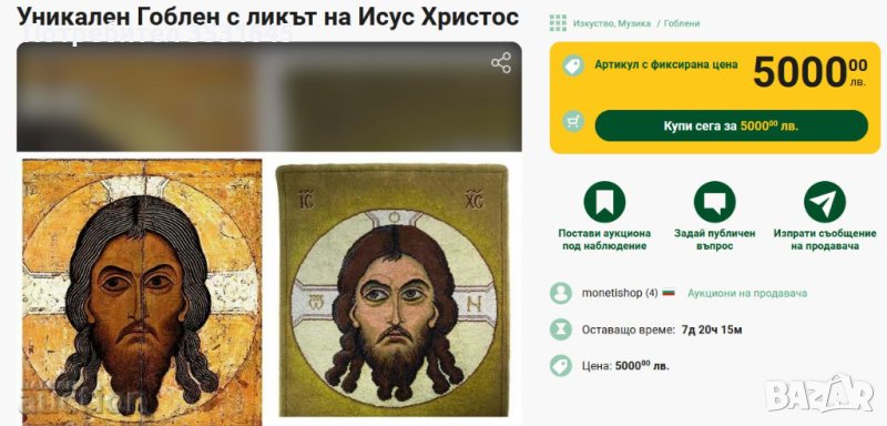 Само сега от 5000лв на 1000лв. от 11.02. до 11.03. 2024г. Огромен тъкан гоблен с изображение на Исус Христос.Този образ предпазва домът и офисът Ви от зли сили, зли очи ид спомага за духовна хармония и просперитет.Този тип Християнско иконографско изображение е по-известно като Уброс-„Образ неръкотворен“ в Европа го наричат„Mandylion” в превод от гръцкото - плащаница, а в Русиякато „Спас Нерукотворный“.Този тип иконографско изображение се среща освен на плащеници, кърпи и гоблени и на Стенописи, и икони.Нашето предложение на най-силно се приближава като стил, иконография и канон до икона от втората половина на XII в. в Новгородската църква "Св. Образ".