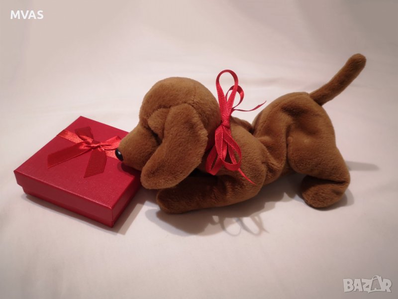 + Играчка кученце с червена панделка, с пълнеж с малки топчета е, 21 см размер