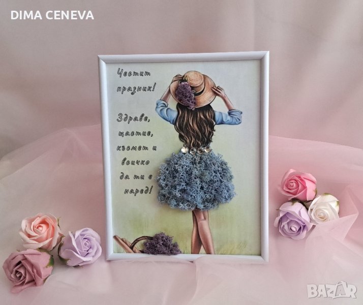 Момиче със синя къса рокля и люляк.Картина с пожелание за здраве и весел празник. Люлякът е символ на благополучие и изобилие.Подходяща за подарък за всеки повод. Декорирана със скандинавски мъх и мъниста.Размер 20/25 см. Може да се изработи и в други размери.