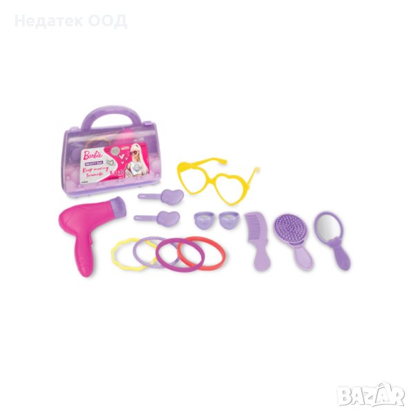 Чанта с козметични аксесоари на любимата ви кукла, в 2 цвята розово и лилаво. Включва сешоар, четка, машинка за подстригване и огледало, гривни, слънчеви очила, пръстени и пинсети. Винаги сте готови да излезете с аксесоари за кукли.