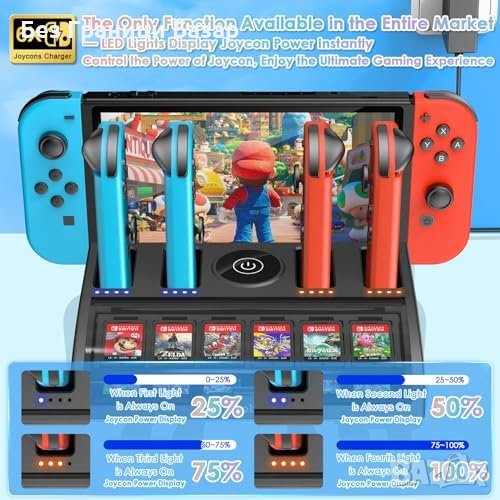 Множество функции в едно: Зарядно за контролери Joycon и докинг станция с 12 слота за игри.