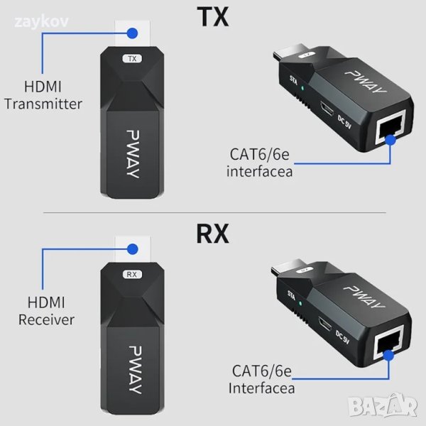 Проектиран с HDMI мъжки на предавателя и приемника, не е необходим HDMI кабел. Необходим е мрежов кабел за свързване на предавателя и приемника.