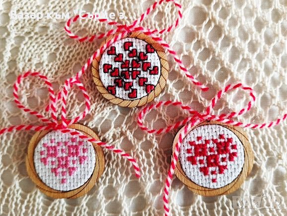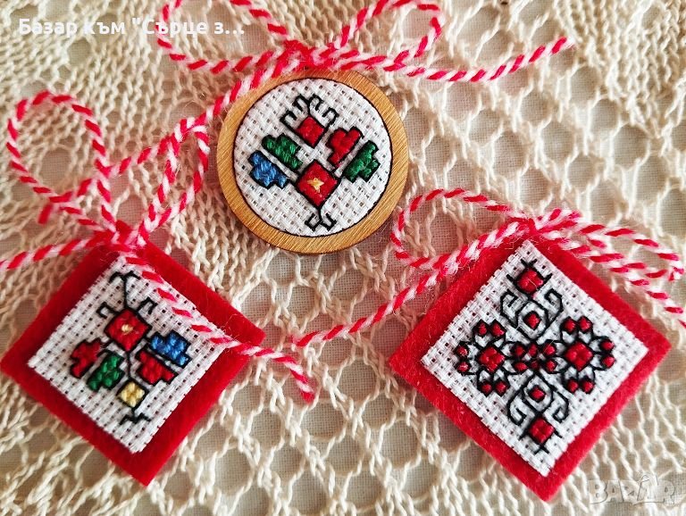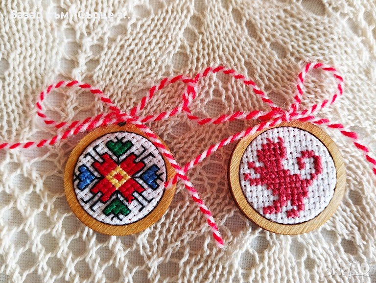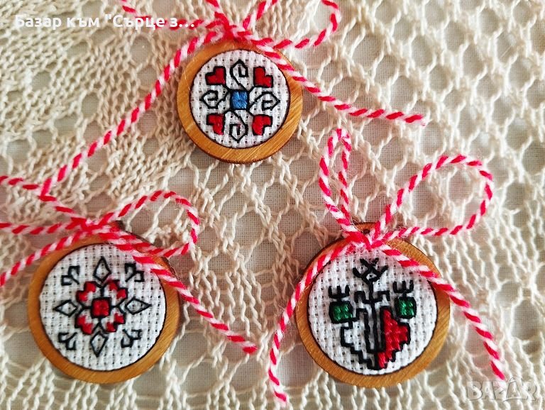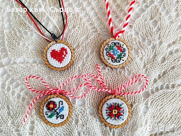 3 Ръчни бродерии с дървена основа - могат да се поръчат като колие с черен, червен или бял конец (снимка горе вляво), като мартеница-колие с пресукан конец снимка горе вдясно) или като мартеница за закачане