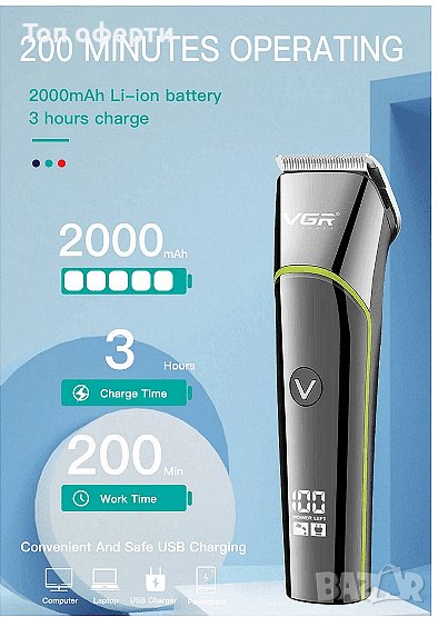 Безжична водоустойчива машинка за подстригване VGR, V-295, Цифров дисплей