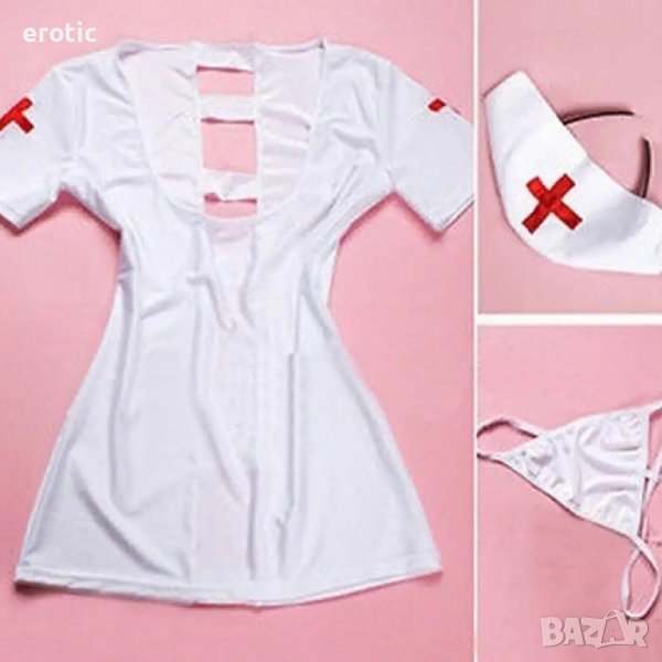 Съблазнителен еротичен костюм на медицинска сестра. Секси костюмът се състои от четири части - еластична рокля, мини прашки, диадема с касинка. Материята е мека на допир и изключително еластична.