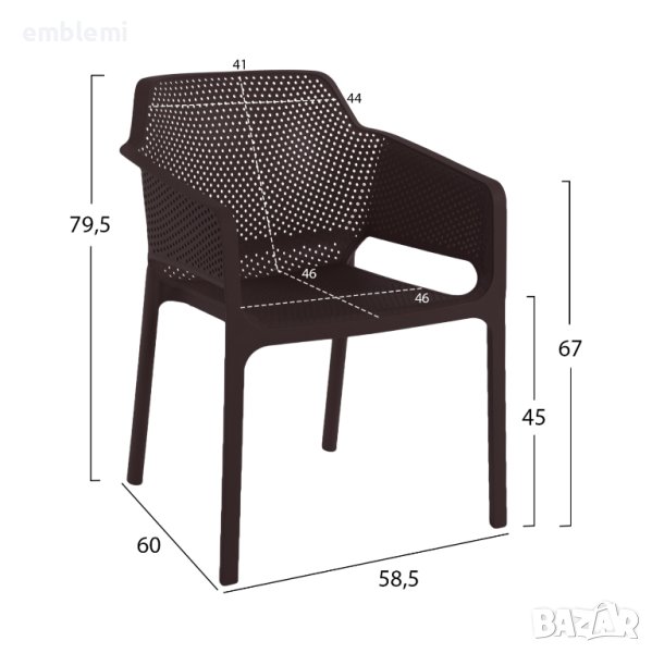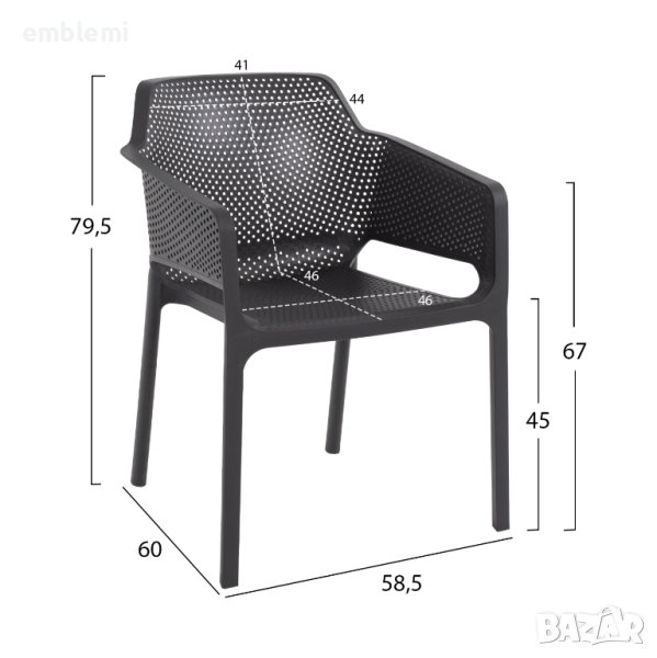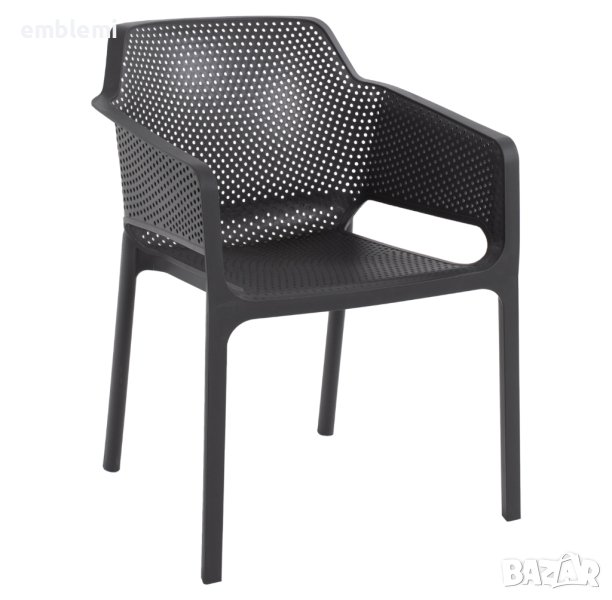 полипропиленово кресло. Идеално предложение за използване във външни пространства, както професионални (банкети, кетъринг компании и др.), така и у дома. Столът се състои от формован и перфориран комплект седалка-облегалка-ръкохватки-крака за по-добра вентилация, докато ръцете са високи и сравнително широки, което води до комфорт по време на употреба. Освен това средната височина на облегалката и седалката са удобни и със сигурност ще зарадват всеки, който седне в това кресло.