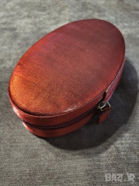 Елипсовидна кутия за бижута от червен сатен.