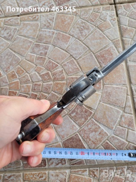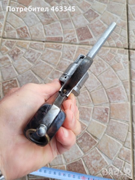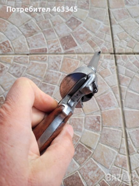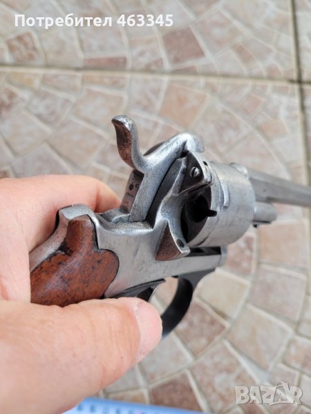 Френски револвер Ле Фуше средния размер. Разработен за щифтови патрони през 19-ти век. Без ръжда. Липсва капачето за зареждане на патроните и шомполчето за избиване на гилзите. Иначе е в прилично състояние. Превърта, но не спуска - бойната пружина на петлето или е откачена или счупена. Нереставриран