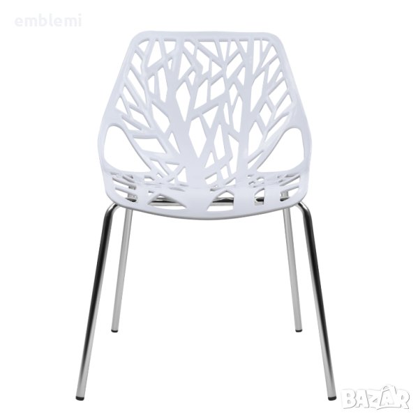 Модерен дизайнерски стол, изработен от полипропилен в бял цвят и хромирана конструкция.
